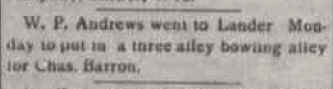 W. P. Andrews left for Lander to install three bowling alleys for Chas. Barron in April 1904.
